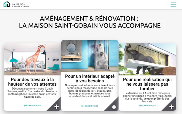 Saint-Gobain annonçait ces derniers jours dans la presse le changement de nom de son site saint-gobain.fr qui devient lamaisonsaintgobain.fr, avec un message clair véhiculé par son communiqué de presse : « accompagnés de A à Z par La maison Saint-Gobain, marque de confiance, les particuliers peuvent passer du rêve à la réalité en toute sérénité ». Cet acteur, fabricant et distributeur s’adressant historiquement aux professionnels, fait ainsi un pas de plus en avant dans la clarification de son discours de marque à destination des particuliers.