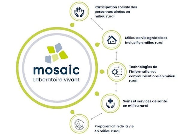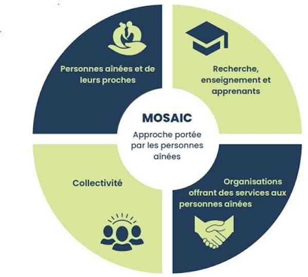 Le laboratoire vivant MOSAIC réunit des partenaires de quatre parties prenantes de même importance, soit des personnes aînées et leurs proches, des personnes représentantes des municipalités et de la collectivité, des organisations offrant des services aux personnes aînées (Centre intégré de santé et de services sociaux de la région, organismes privés ou communautaires) et des personnes du milieu de la recherche et de l’enseignement incluant étudiantes et étudiants de la relève en recherche.